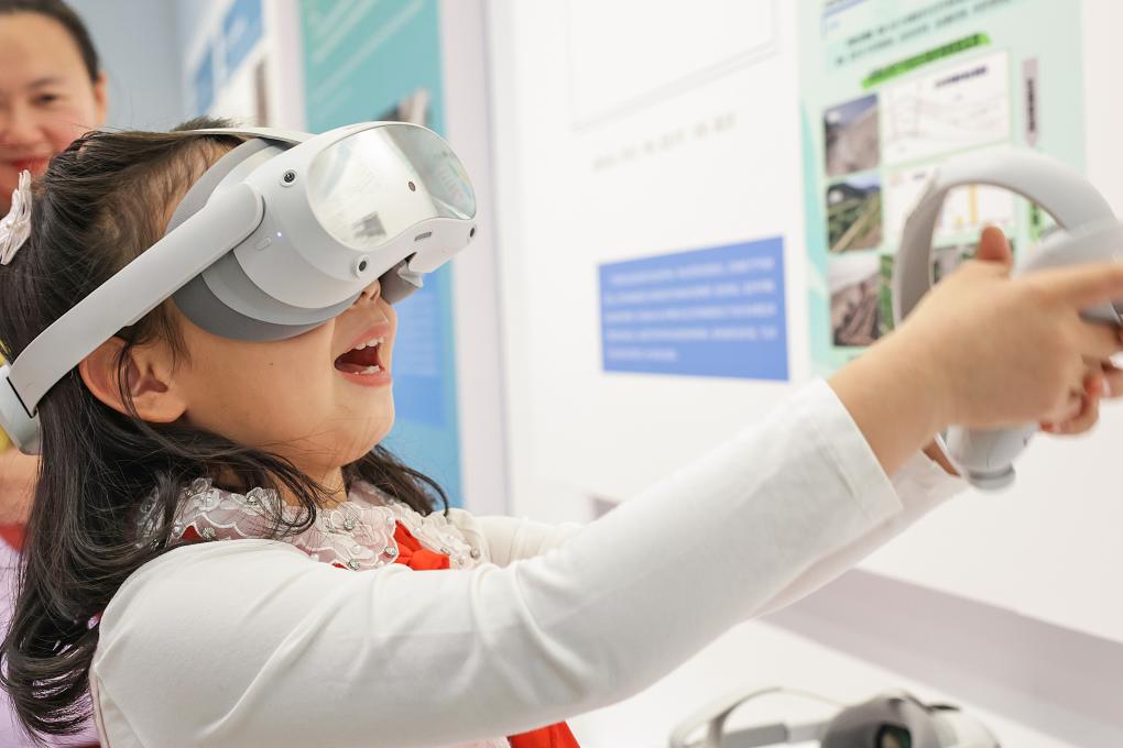 11月28日,一名小朋友在展览上体验围棋学习互动装置。