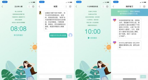 针对职场压力的情绪管理,小程序中从听、说、读、问等方面多角度地给出了专业建议,特设置了“五分钟入睡”、“十分钟高效休息”、“心坊影院”等引导小课程,给存在困扰的用户提供心理音频疏导和专业心理知识,以提升她们的自我心理认知与管理技巧,缓解焦虑心态,此外,还设有“树洞”、“辩护练习”等提问互动版块。