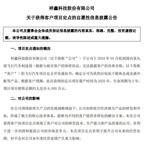公告称,祥鑫科技子公司于2024年5月收到国内某头部飞行汽车制造商的飞行汽车项目定点开发通知书,确定公司为其供应电池下箱体总成及液冷板等产品。